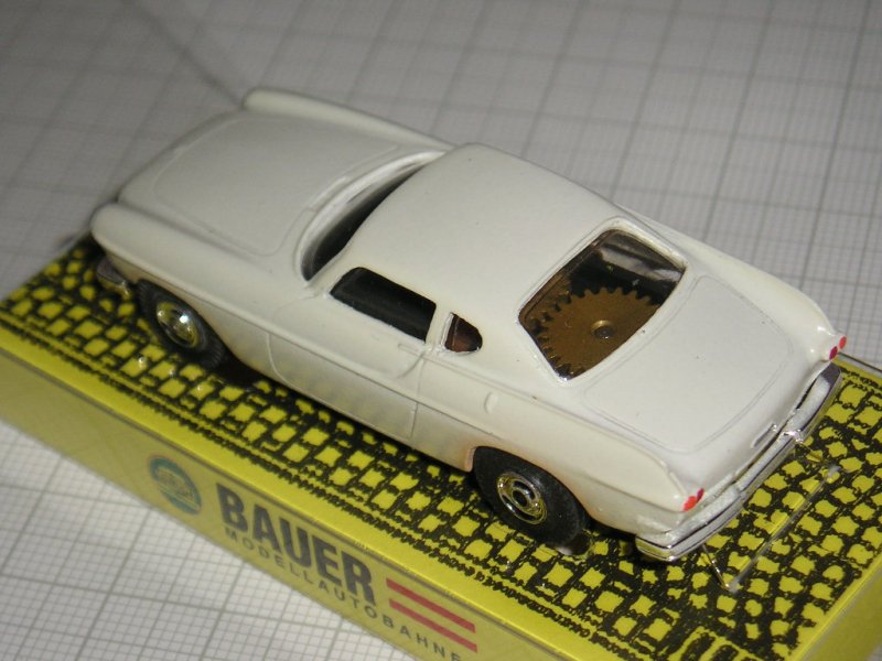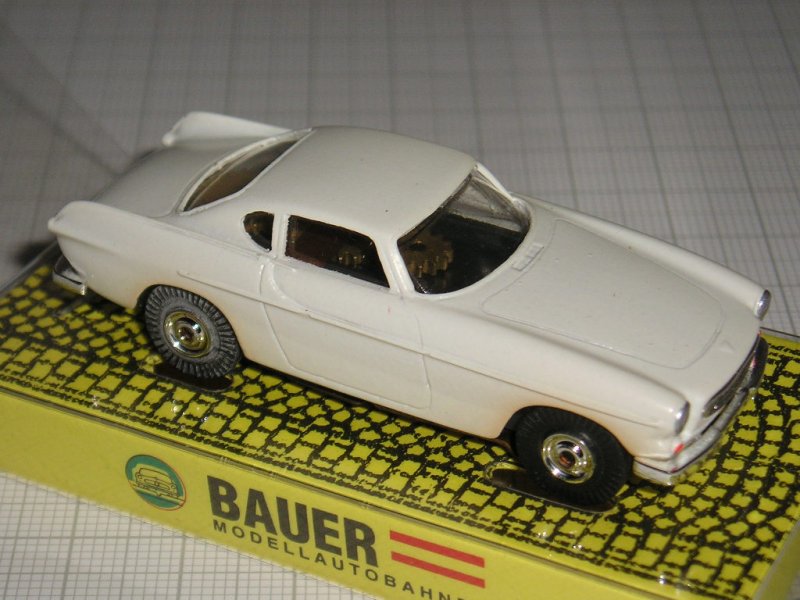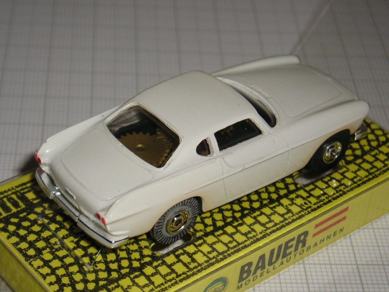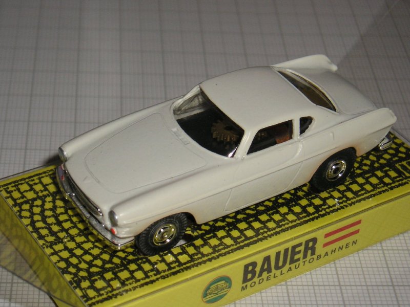 In the year 1994 Bauer started the production of the Volvo 1800 S slotcars. Bauer plastic slotcars are manufactured in the scale 1:70 and they are great completions for the other slotcar brands in this scale like Aurora or Faller. Bauer Volvos run on Faller racetracks! The first Volvo was the white car with no. 3251, then followed the darkblue car no.3252, the red car no.3253, the racing yellow car no.3254 with wide tyres on deep 5-spoke wheels and different additional racenumber-stickers, the darkgreen Rallye car no.4255 with wide tyres on other deep wheels and the yellow frontgrille trimring and last but not least the bluemetallic car with no. 4256. Bauer slotcars come in clear foil boxes fixed on yellow paper plates marked with "Bauer Modellautobahnen". Peter 19/02/06 |